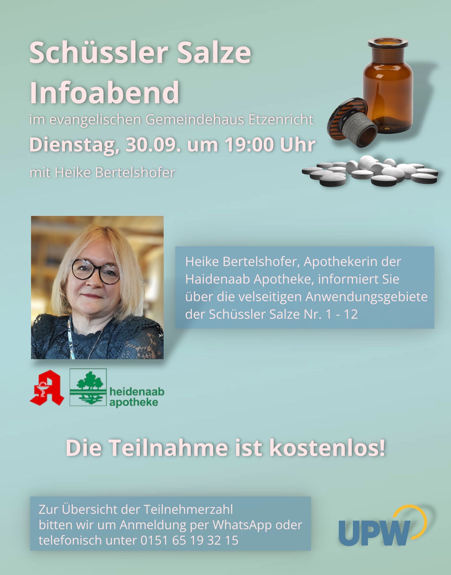 Evang. Gemeindehaus EtzenrichtHeike Bertelshofer, Apothekerin der Heidenaab Apotheke Weiherhammer, informiert über die vielseitigen Anwendungsgebiete der Schüssler Salze 1 bis 12. Zur Übersicht der Teilnehmerzahl bitten wir um Anmeldung per WhatsApp oder telefonisch unter 0151 65 19 32 15.