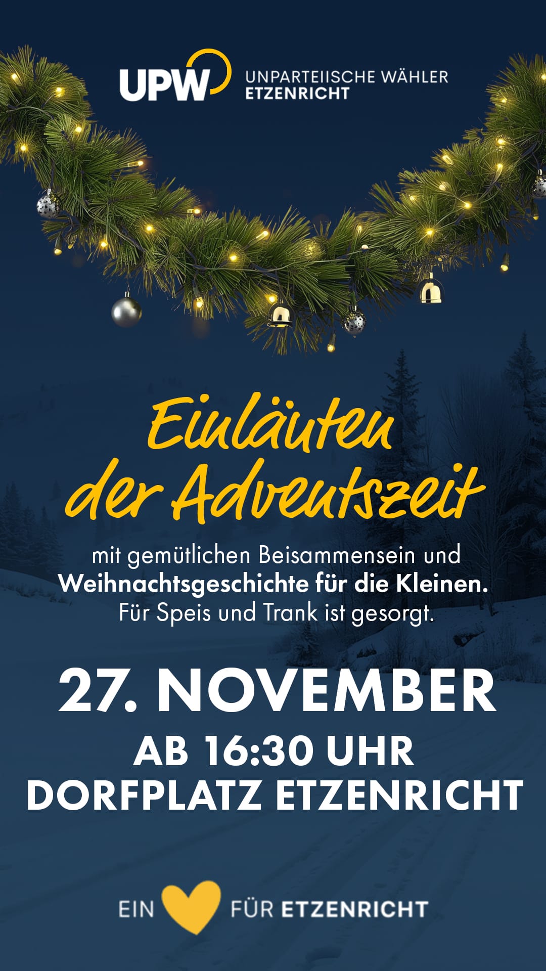 Dorfplatz, EtzenrichtDie UPW Etzenricht lädt alle Bürgerinnen und Bürger zum Einläuten der Adventszeit mit gemütlichen Beisammensein am Dorfplatz ein. Mit Weihnachtsgeschichte für die Kleinen und für Speis und Trank ist selbstverständlich gesorgt.